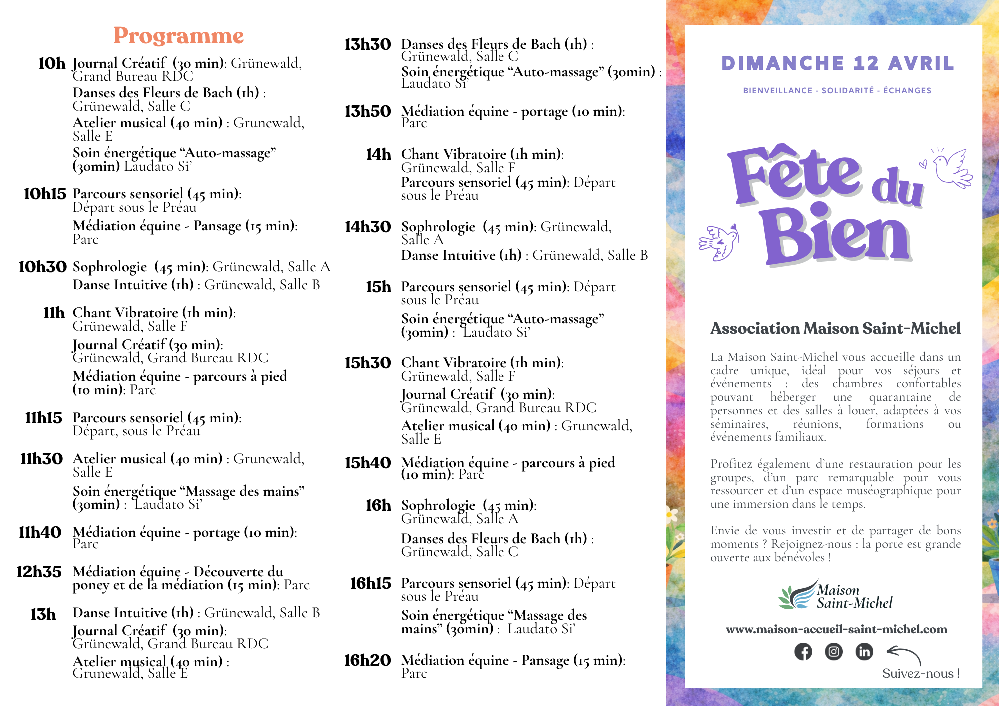 La Fête du Bien se déroule de 10h à 17h, dans le cadre naturel et apaisant de la Maison Saint-Michel et de son grand parc à Issenheim.
